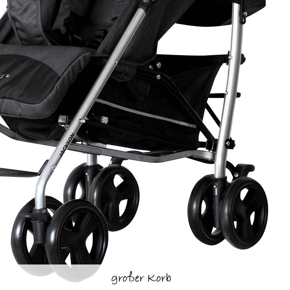 Mit dem Jackson kommst Du dank seiner schwenkbaren, kleinen Vorderräder bestens in engen Supermarktgängen zurecht. Festgestellt eignen sich die laufruhigen Doppelräder auch für ausgiebige Spazierfahrten auf asphaltierten Wegen. Mit seinen 8 kg ist der Buggy außerdem ein echtes Leichtgewicht. Du kannst ihn leicht auf ein kompaktes Maß (105 x 29 x 31 cm) zusammenklappen und dann problemlos im Auto mitnehmen.