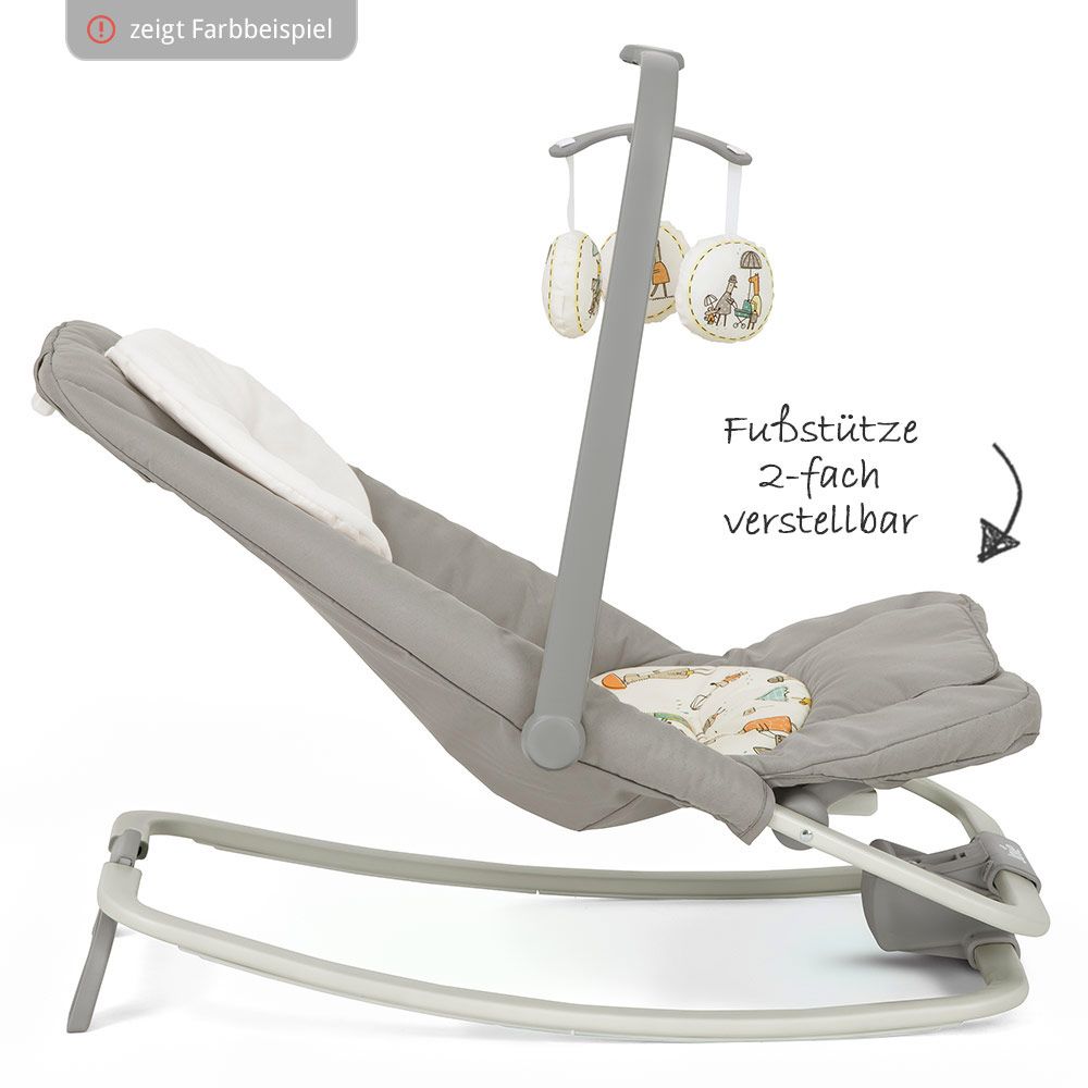 Die Wippe bewegt sich sanft, wenn sich Dein Kleines bewegt oder Du ihr ein bisschen Schwung gibst. Dank der ausklappbaren Stützen am Rahmen kann der Sitz aber auch festgestellt werden. Die Sitzeinheit ist dreifach im Neigungswinkel verstellbar, die Fußstütze zweifach. So kann Dein Kind ein gemütliches Nickerchen halten oder in einer etwas erhöhten Position seine Umgebung betrachten. Während es in der Wippe liegt, wird Dein Kleines vom gepolsterten 3-Punkt-Gurt sicher gehalten. Dieser ist dreifach höhenverstellbar und lässt sich so individuell anpassen.