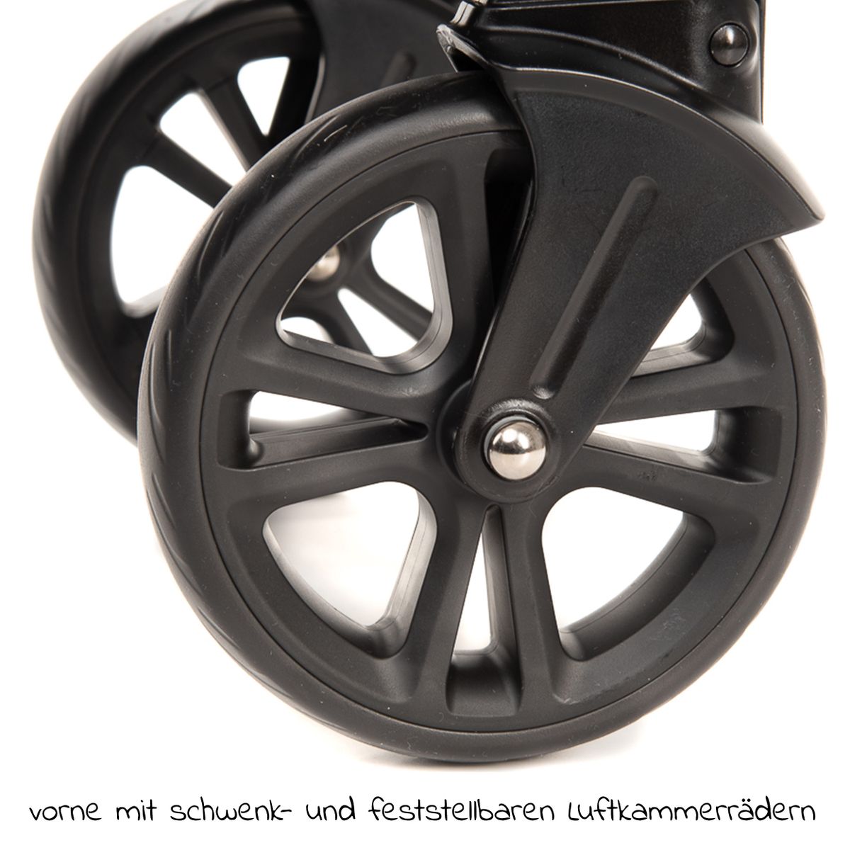 Die pannensichere All-Terrain Bereifung des Wagens ermöglicht Dir eine sehr flexible Nutzung. Egal ob Stadt, Park oder auf Waldwegen - durch die großen Räder kannst Du mit dem Buggy fast überall fahren. Für den notwendigen Komfort sorgt eine Federung an allen Rädern. Diese sind mit vielen kleinen Luftkammern gefüllt und verbinden so Pannensicherheit mit dem Komfort von Lufträdern. Die Vorderräder lassen sich frei schwenken und können im Gelände festgestellt werden. Solltest Du im Kofferraum mal wenig Platz haben, kannst Du alle Räder abnehmen.
