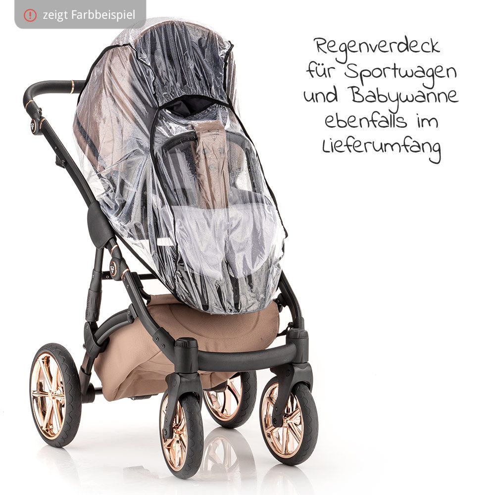 - Ausstattung: kugelgelagerte Luftkammerräder, schwenkbare & feststellbare Vorderräder, 5-fach höhenverstellbarer Schieber, 5-Punkt-Gurt, umsetzbare Sitzeinheit, 5-fach verstellbare Fußstütze, 4-fach verstellbare Rückenlehne, großes Verdeck mit Belüftungsöffnung & UV-Schutz 50+, abnehmbarer, aufklappbarer Frontbügel mit Durchrutsch-Schutz, Sitzauflage, Feststellbremse, Babywanne mit Belüftungssystemleichtes Aluminium-Gestell, hochwertige Stoffe, geräumiger, verschließbarer Gestellkorb, einstellbare Federung, lässt sich mit dem Sportsitz klein zusammenfalten, Wickeltasche mit Wickelunterlage, Beindecke für den Sportwagenaufsatz, Schutzdecke für die Wanne, Regenschutz & Insektenschutz für Wanne & Sportwagensitz, Becherhalter, Fußsack, Handmuff