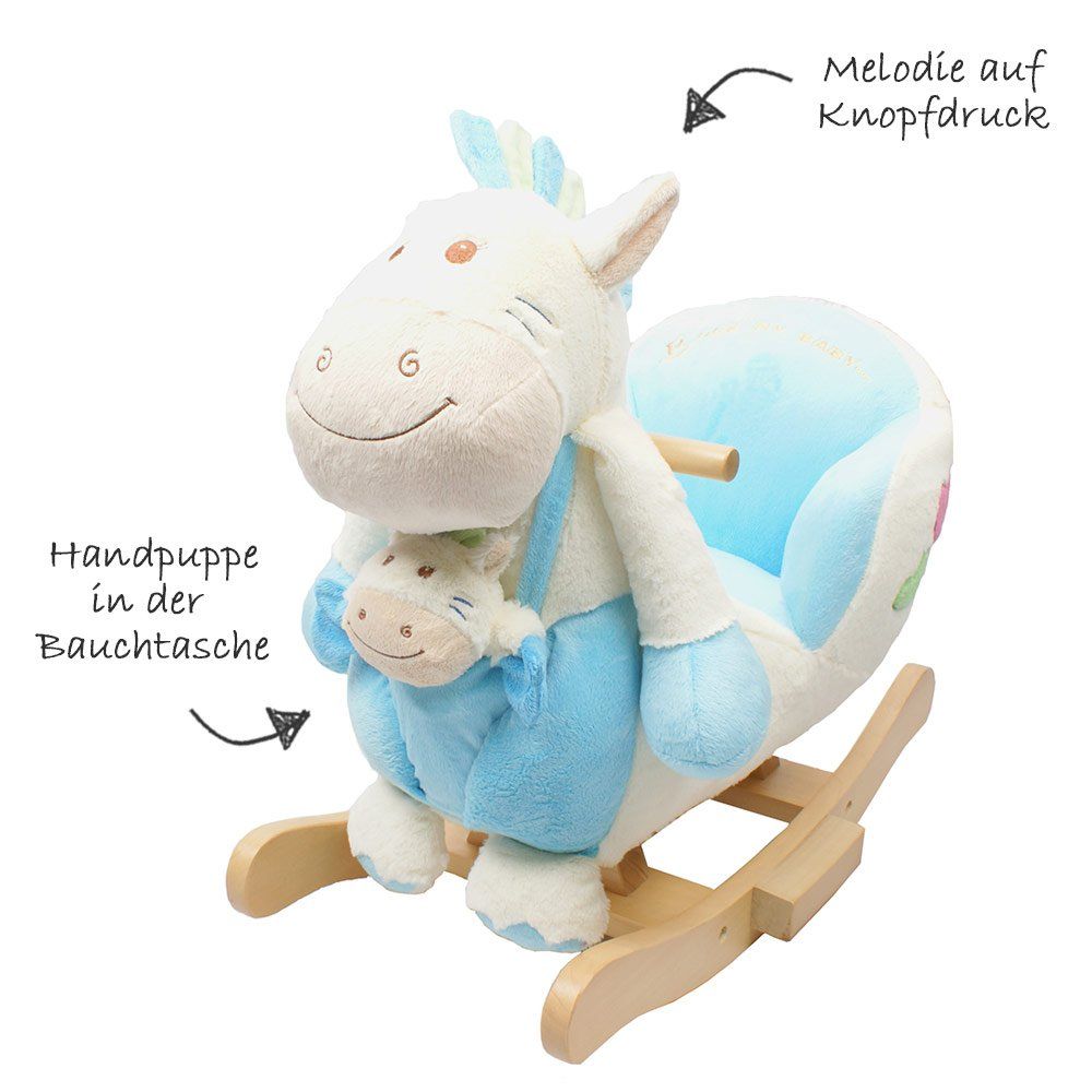 Auf dem kuscheligen Schaukeltier Pony Mika von Knorrtoys können bereits die Kleinsten in Ihrem Kinderzimmer auf großen Ausritt gehen. Dank der gepolsterten Rückenlehne und Sitzfläche sitzt Ihr Kind sicher und bequem im Sattel. Während des Schaukelns kann sich Ihr Kind an den robusten Holzgriffen gut festhalten und wenn es das Ohr des Ponys drückt; ertönt ein schönes Baby-Wiegenlied. Ihr Kind trainiert beim Schaukeln spielerisch seinen Gleichgewichtssinn und diesem süßen Pony kann sicher niemand widerstehen.
