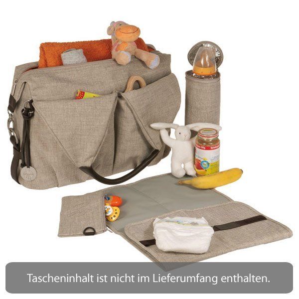 Die umfangreiche Ausstattung, Applikationen aus Lederimitat, raffinierte Details und der schicke Schnitt werden Sie überzeugen. In dem geräumigen Hauptfach finden alle Utensilien Platz, die Sie und Ihr Kind unterwegs benötigen – vom Schnuller bis zur Geldbörse. Zur bewährten Ausstattung gehören außerdem herausnehmbare Innenfächer für Gläschen; eine wasser- und bakterienabweisende Wickelunterlage, ein Feuchtfach, ein Flaschenhalter und viele weitere Möglichkeiten zum Verstauen der Windeln und Co.
