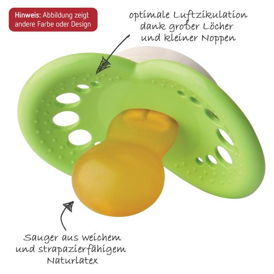 Dieser Beruhigungssauger eignet sich für Babys ab 16 Monaten. Er ist kiefergerecht geformt und dank großzügiger Luftlöcher und Noppen gut für die Haut. Der Sauger besteht aus Latex und ist antistatisch (d.h. er zieht Fusseln weniger an). Er ist zudem sehr elastisch und robust.