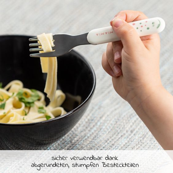 Mit dem 6-teiligen Besteck-Set von MiaMia im fröhlich gepunkteten Design wird das selbstständige Essen zu etwas ganz Besonderem: Es ist ideal auf die motorischen Fähigkeiten Deines kleinen Feinschmeckers abgestimmt und hat ein altersgerechtes Gewicht sowie genau die richtige Größe und Form. Dank abgerundetem Löffel, Messer und stumpfen Gabelzinken kann Dein kleiner Weltentdecker alle Besteckteile bedenkenlos in die Hand nehmen.