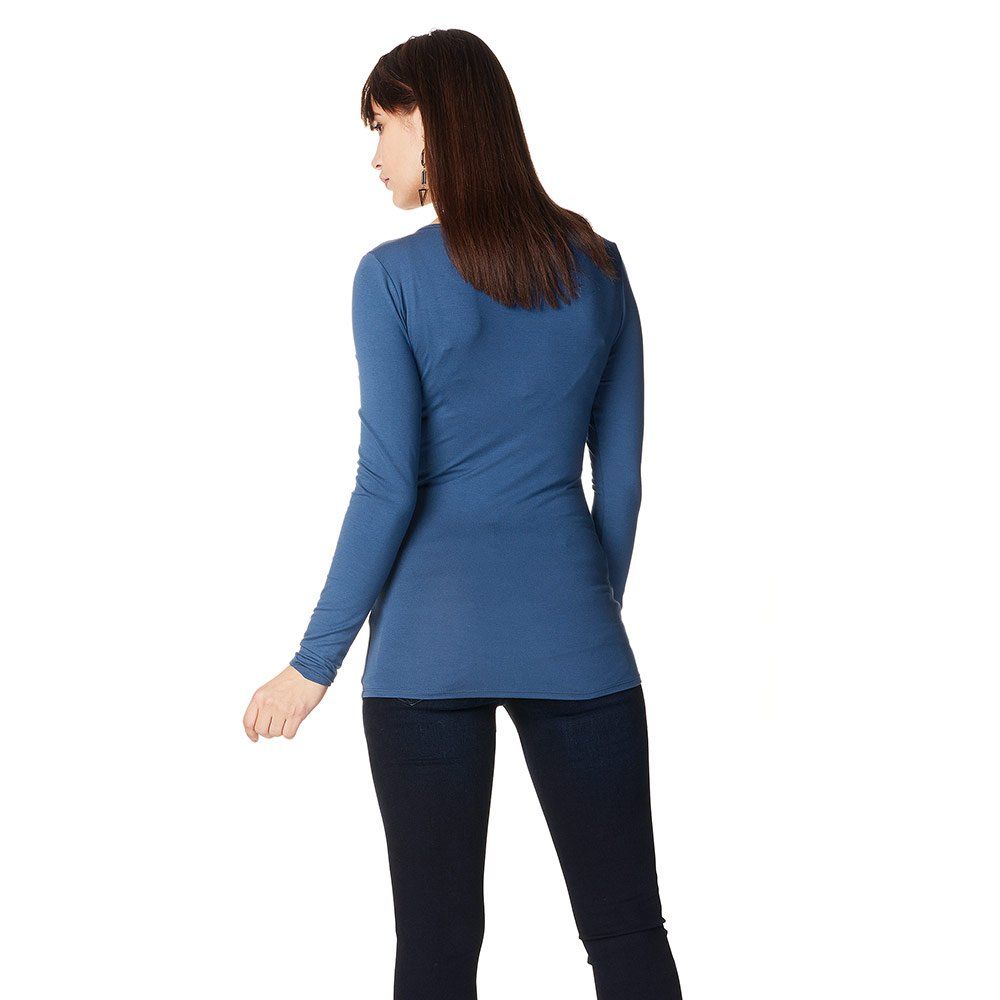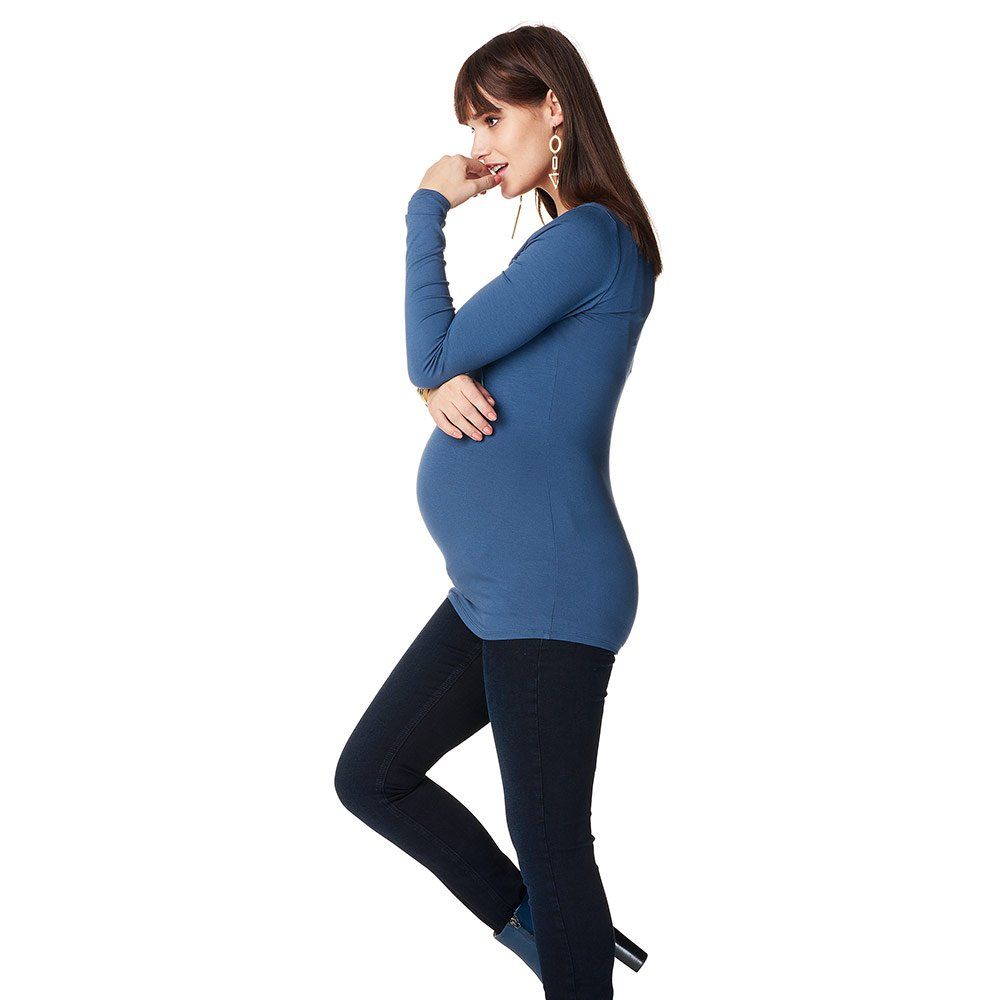Das Langarm-Still-Shirt Anna in Dunkel-Petrol von Noppies können Sie während Ihrer gesamten Schwangerschaft und Stillzeit tragen. Das angenehme Material ist besonders elastisch und wächst mit Ihrem Babybauch einfach mit! Für die Stillzeit hat das Oberteil eine praktische Funktion: Sie können den V-Ausschnitt bequem nach unten ziehen und das darunterliegende Top nach oben schieben. So können Sie Ihr Baby schnell und diskret anlegen. Hübsches Detail ist der Tunnelzug mit Samtband zum Raffen oberhalb der Brust.