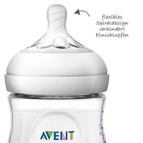 Die 125 ml PP-Flaschen Naturnah SCF030/27 von Philips AVENT haben einen ultra-weichen Silikon-Sauger Gr. 1 mit flexiblem Spiraldesign. Die besonders weiche Textur imitiert das Gefühl an der mütterlichen Brust. Der breite, brustähnliche Sauger ist zudem mit Komfortkissen ausgestattet, um eine problemlose Kombination von Stillen und Flaschenernährung zu ermöglichen. So ist naturnahes Trinken möglich, ohne dass der Sauger einschlupfen kann. Das Anti-Kolik-System verringert das Risiko, dass Dein Baby beim Trinken Luft schluckt und verhindert somit Koliken und Unwohlsein.
