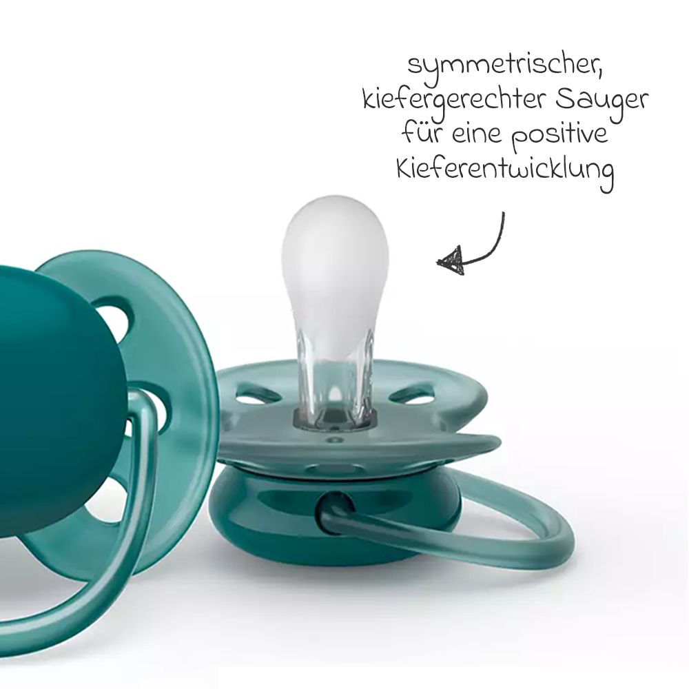 Der symmetrische und kiefergerechte Sauger besteht aus seidigweichem Silikon mit strukturierter Spitze. Der strukturierte Silikon-Sauger beruhigt Babys und wird besonders gut angenommen. Die gesunde Zahnentwicklung Deines Babys während seines Wachstums wird vom Ultra Soft Schnuller unterstützt.