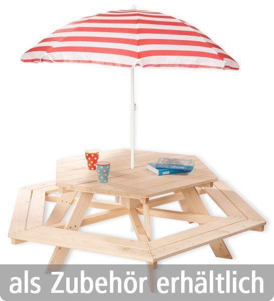 Diese robust und stabile Kindersitzgruppe “Nicki 6-Eck“ von Pinolino ist vielseitig einsetzbar und ein Riesenspaß für die Kleinen. Der Picknicktisch lädt zum Spielen, Lesen, Malen, Basteln und Essen ein. Ob alleine oder mit Freunden, an der Tischkonstruktion mit rundum verlaufenden Bänken finden bis zu 6 Kinder Platz.