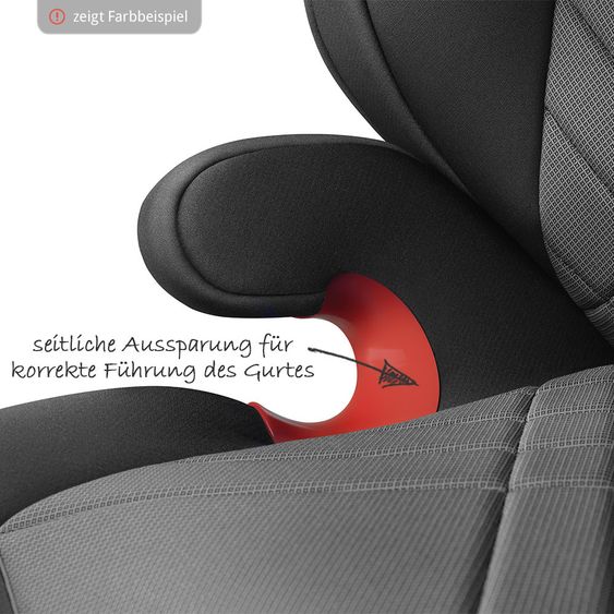 Dein Kind wird im Sitz mittels 3-Punkt-Fahrzeuggurt angeschnallt. Rot markierte Führungen am Kindersitz helfen beim korrekten Anschnallen und tragen so wesentlich zur Sicherheit bei.