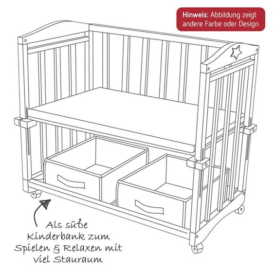 Eine weitere Möglichkeit der Nutzung kommt zum Einsatz, sobald Dein Baby etwas größer ist. Nimmst Du die Stoffseite ab, wird aus dem Stubenbett eine gemütliche Kinderbank, die auch dann noch im Kinderzimmer eine gute Figur macht, wenn der Nachwuchs bereits in ein größeres Bettchen umgezogen ist.