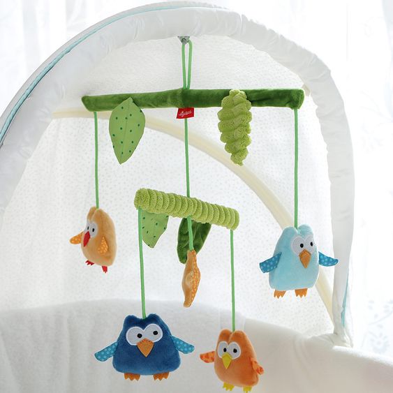 Das fantasievolle Mobile Eulen von Sigikid ist ein echter Hingucker im Kinderzimmer und führt Dein Baby sanft ins Land der Träume. Die bunten Eulen drehen sich langsam und wecken die Neugierde Deines Kindes. Der weiche Stoff und die bunten Farben geben Deinem Nachwuchs gleichzeitig erste optische Reize. Du kannst das Mobile beispielsweise über der Wickelkommode anbringen und sorgen so für eine tolle Ablenkung. Aber auch die Decke über dem Bettchen ist ein guter Ort: Dein Kleines kann die Tierchen betrachten und sich davon in den Schlaf begleiten lassen.