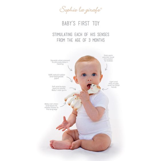 Für die Kleinsten ist ein kleiner Kuschelfreund sehr wichtig: Er ist immer mit dabei und tröstet in schwierigen Situationen. Das niedliche Spieltier aus Naturkautschuk - Sophie la girafe®, verpackt in einer schönen Geschenkbox, begleitet Deinen kleinen Engel und weckt seine Neugier. Ausgestattet mit einem integrierten Quietscher, ist Sophie für die Ohren Deines kleinen Schatzes sehr interessant. Außerdem kann Dein Kleines sie mit dem Mund, den Augen und seinen kleinen Händchen erkunden.