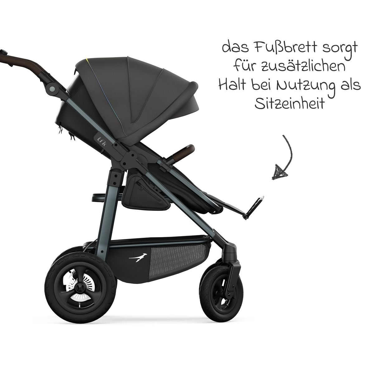 - Ausstattung: wasserabweisendes Verdeck mit UPF 50+, Komfort-Matratze, 5-Punkt-Gurt, Kopf- und Schulterpolster, Bauchbügel, verstellbares Fußbrett, Universal Regenschutz, Universal Sonnensegel, Universal Insektenschutz