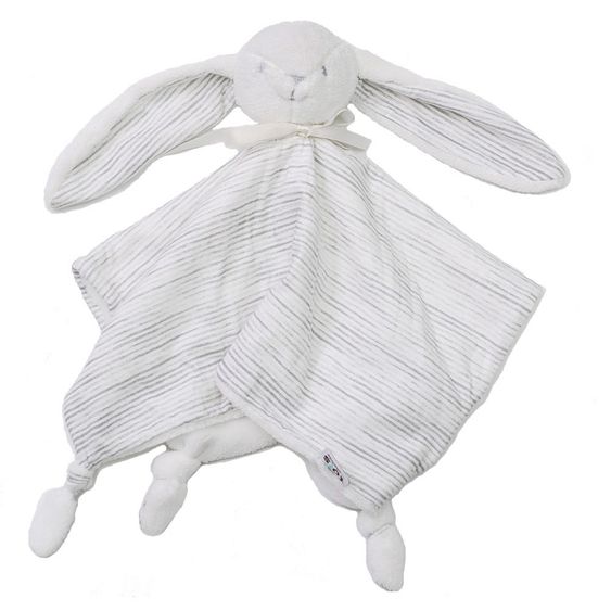 Niedlicher, flauschiger Freund zum Schnuffeln und Liebhaben: Das Schmusetuch Hase – Classic Grey von Tots by Smartrike hat ein süßes Streifenmuster und liebevoll gesticktes Gesicht. Die langen Ohren laden ebenso wie die vier Knotenenden zum Greifen und Festhalten ein.